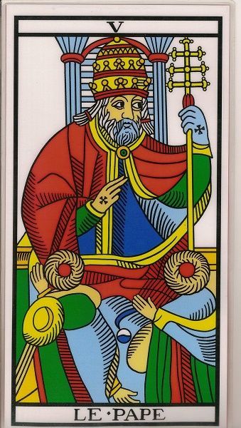 La carta del papa simboliza al guardián de las verdades espirituales, tiene un poder revelador que se manifiesta en las áreas del pensamiento. Buscando la comprensión del universo, de acuerdo a la teología y la filosofía. Muestra la capacidad de comprender y analizar los que se percibe a través de los sentidos. Simboliza la actitud ética del maestro y de la conciencia.